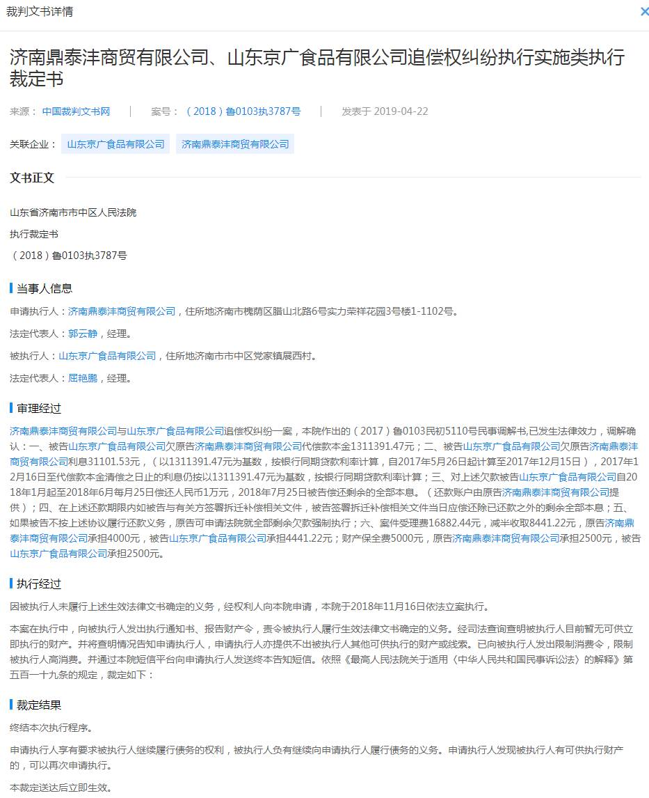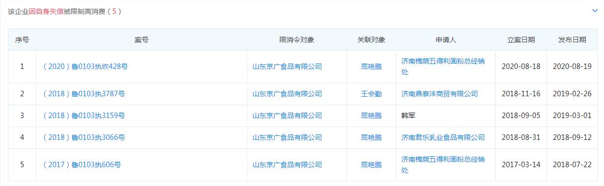 從2016年6月至今,山東京廣食品有限公司被執(zhí)行總金額高達(dá)3542201元,其中最高的一次是1342493元。這次,山東京廣食品有限公司同樣因?yàn)榍窛?jì)南鼎泰灃商貿(mào)有限公司的債務(wù)無法償還而被法院限制高消費(fèi)。
