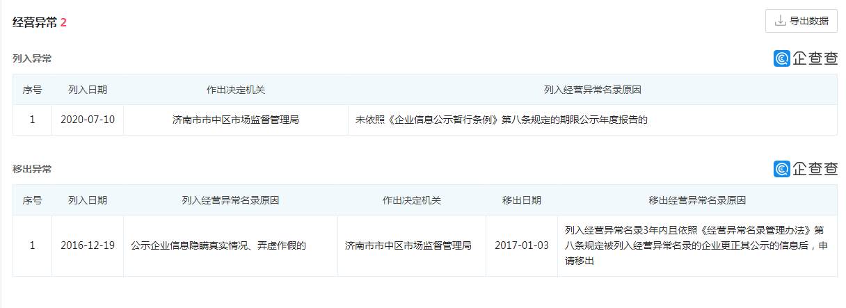 2016年12月19日,山東京廣食品有限公司因隱瞞真實(shí)情況、弄虛作假被濟(jì)南市市中區(qū)市場(chǎng)監(jiān)督管理局列入經(jīng)營異常名錄,2017年1月3日被移出后,僅過了3年,2020年7月10日,因未依照《企業(yè)信息公示暫行條例》第八條規(guī)定的期限公示年度報(bào)告,濟(jì)南市市中區(qū)市場(chǎng)監(jiān)督管理局再次將其列入經(jīng)營異常名錄至今。