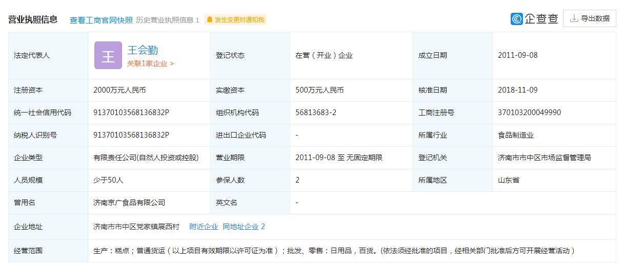 記者通過企查查查詢發(fā)現(xiàn),山東京廣食品有限公司成立于2011年9月8日,注冊(cè)資本2000萬元人民幣,主要經(jīng)營生產(chǎn)糕點(diǎn),普通貨運(yùn),批發(fā)、零售日用品、百貨,公司法人經(jīng)歷過2次變更。山東京廣食品有限公司曾因自身失信被先后5次限制高消費(fèi)。