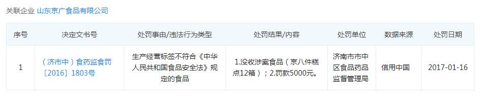 而在2017年1月16日,山東京廣食品有限公司因生產(chǎn)經(jīng)營標(biāo)簽不符合規(guī)定被作出沒收涉案食品(京八件糕點(diǎn)12箱)、罰款5000元的處罰。