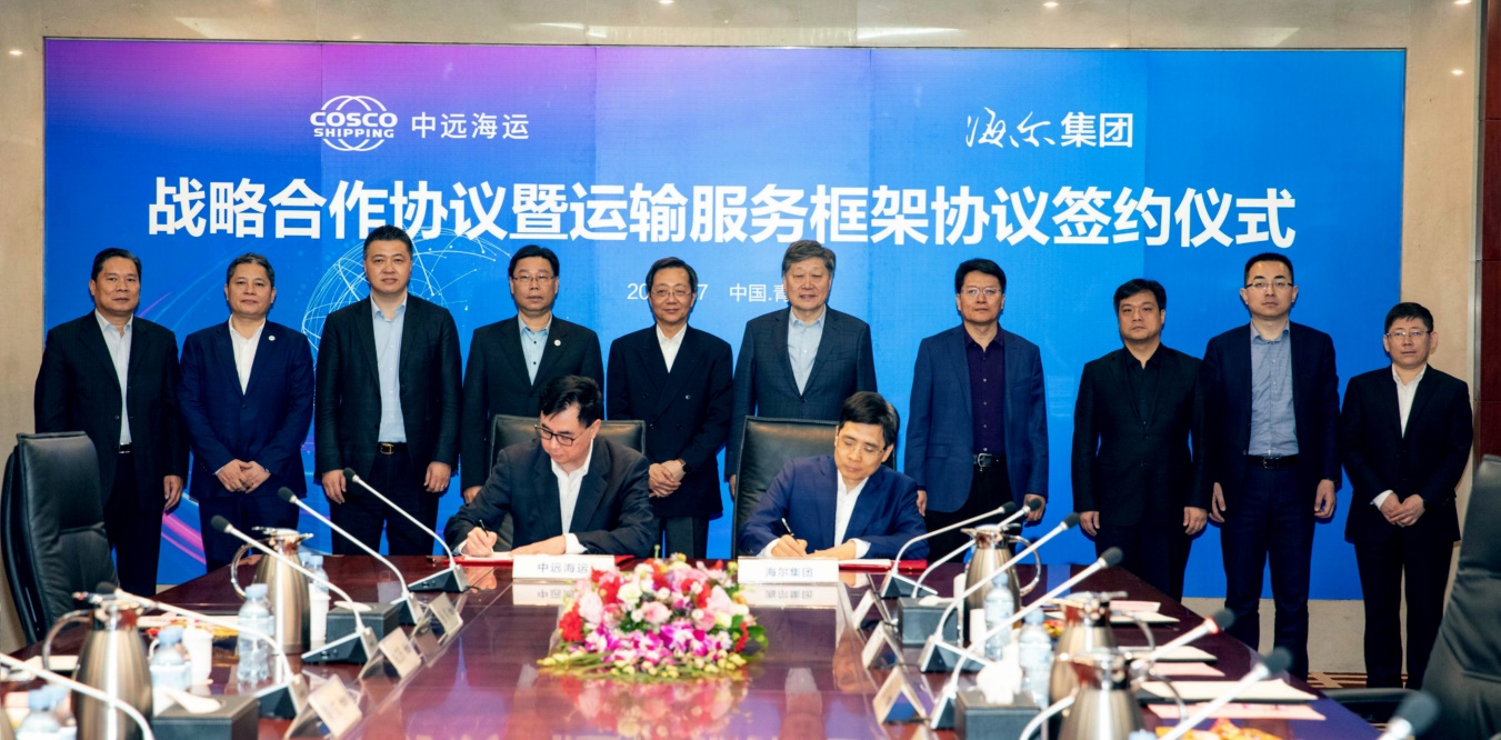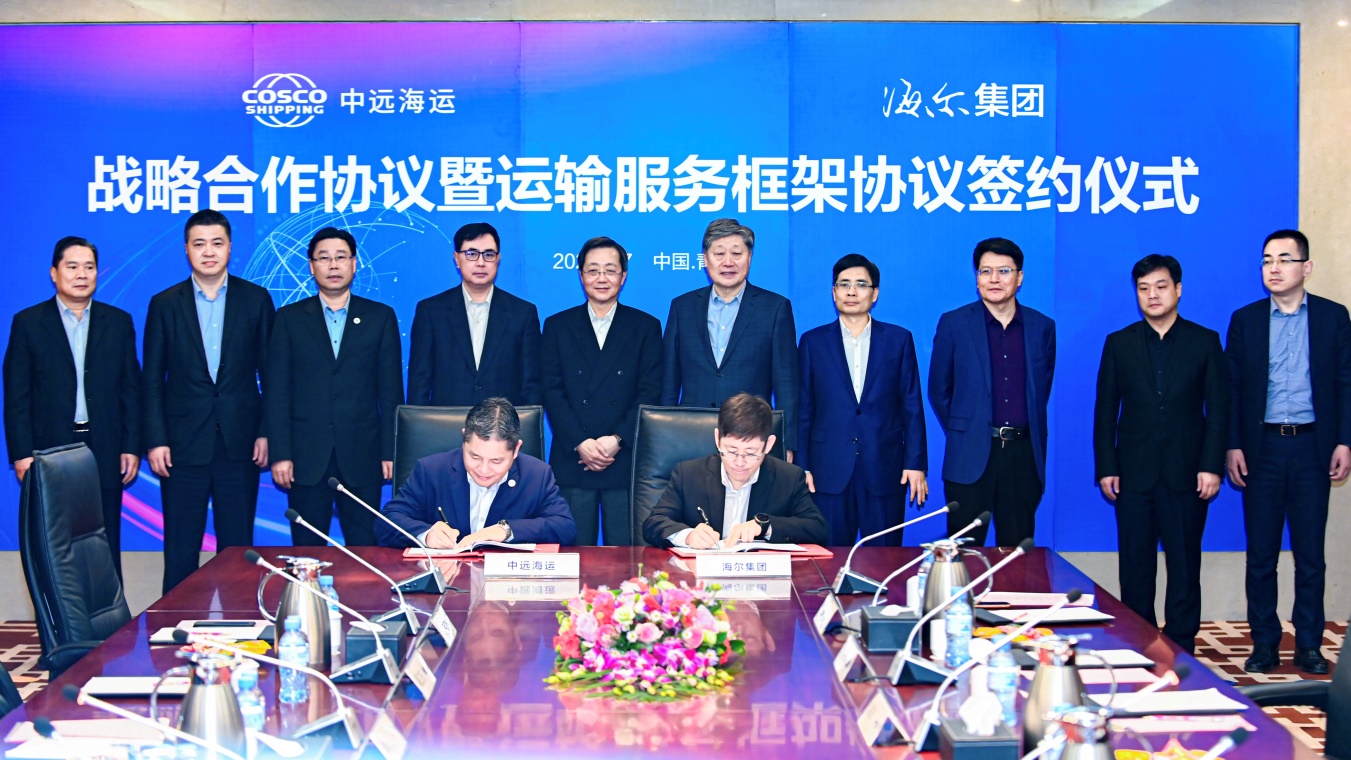 (海爾集團(tuán)董事局副主席、總裁周云杰與中遠(yuǎn)海運(yùn)集團(tuán)副總經(jīng)理、黨組成員黃小文簽訂戰(zhàn)略合作協(xié)議)