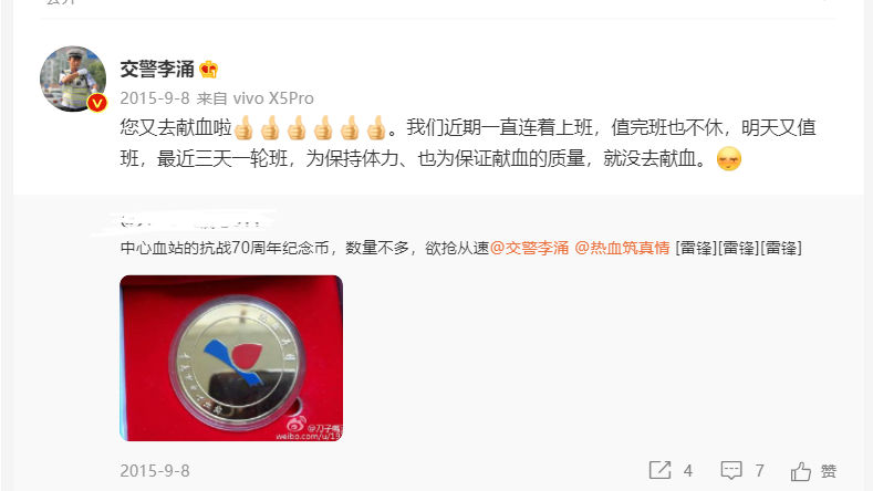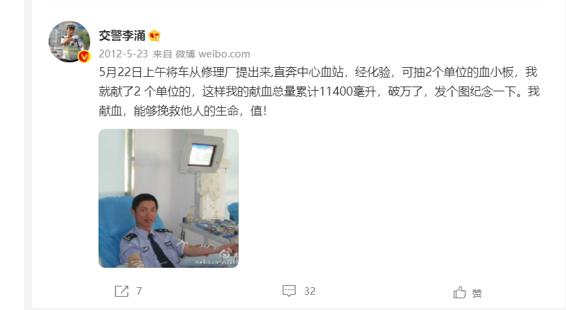 趙會霞講的這件事,李涌同樣記錄在微博上,他記錄了當時接到電話后的所感所想。2015年4月8日,李涌在微博中寫道:“4月7日9點10分早高峰回隊剛吃早飯,接中心血站電話:急需A型血小板,詢問我能否捐獻。我告知近期連續值班,且今晚還有夜查不便于捐獻。但回頭細想,這是醫生在為素不相識的病號向我求助!于是請指導員代班,自己去中心血站捐獻了一個治療單位的血小板。為此,也實現自己累計獻血超過2萬毫升。”