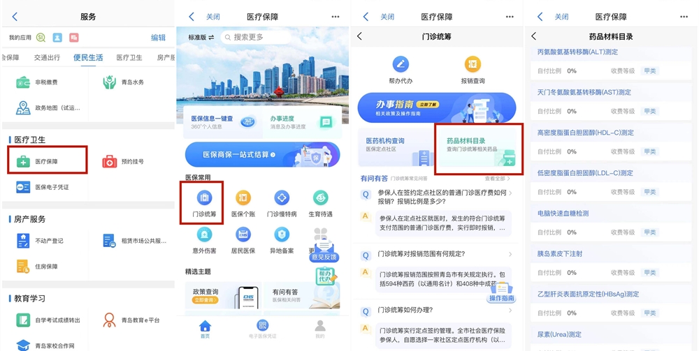 “愛山東·青e辦”內的“醫療保障”應用,可掌上查詢最新的國家藥品目錄,且查詢步驟簡單。首先,在“愛山東·青e辦”APP首頁點擊“更多”,進入“服務”詳情頁找到醫療衛生分類下的“醫療保障”應用;然后,在應用詳情頁的“醫保常用”模塊下找到“門診統籌”點擊進入;最后,在“門診統籌”頁面點擊“藥品材料目錄”即可查詢藥品目錄清單、自付比例、收費等級等藥品報銷信息。