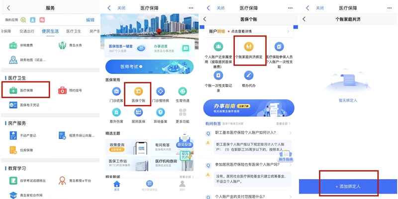 需要注意的是,職工醫保個人賬戶家庭共濟使用,必須將家庭成員醫保電子憑證激活關聯后方可使用,關聯的近親屬數量最多不超過7個?!皭凵綎|·青e辦”中只需操作三步,即可進行醫保個人賬戶家庭共濟綁定。首先,在APP首頁服務推薦欄點擊“更多”,進入服務詳情頁,在醫療衛生分類下,找到“醫療保障”點擊進入。第二步,在“醫保個賬”服務詳情頁選擇“個賬家庭共濟綁定”。第三步,在個賬家庭共濟綁定頁面點擊“添加綁定人”,填寫需要綁定的親屬信息,即可完成綁定。綁定后即時生效,已經綁定的參保人在定點醫藥機構就醫購藥時,可通過掃描醫保電子憑證消費職工參保人的醫保個人賬戶金。