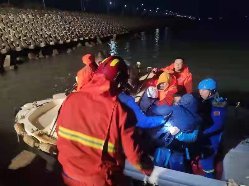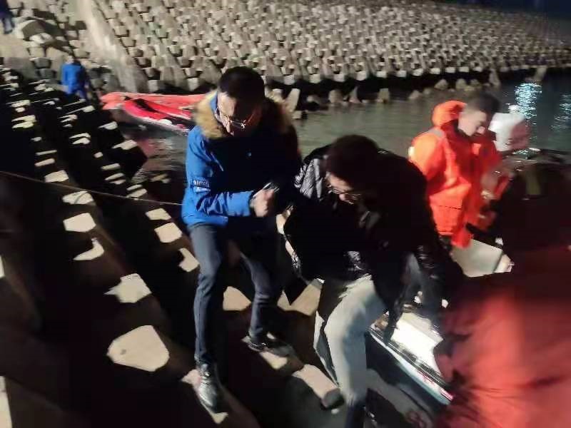 接指令后隊員根據現場情況進行分工,由保溫性和安全性更大的37609船進行營救,藍天救援隊員駕駛沖鋒舟進行外圍保障。因風力和浪比較大,37609船考慮到安全性無法抵近營救。經過緊急研判,藍天救援隊派一名隊員登上37609船協助,沖鋒舟抵近出事船只繼續實施保障并配合營救。10分鐘后四名被困人員陸續營救上船并緊急返航。