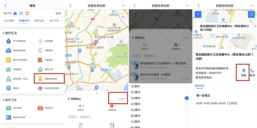 “愛山東·青e辦”中只需操作兩步,即可實現核酸檢測點一鍵查詢。首先,在APP首頁服務推薦欄點擊“更多”,進入服務詳情頁,在“便民生活”分類下,找到“核酸檢測地圖”點擊進入,或在APP首頁頂端搜索欄直接搜索“核酸檢測地圖”點擊進入。第二步,在“核酸檢測地圖”服務詳情頁根據個人定位選擇查詢的周邊范圍后(查詢時請保持手機定位功能開啟并允許“愛山東·青e辦”APP訪問您的地理位置),即可在查詢結果中根據距離和營業時間選擇合適的檢測點。