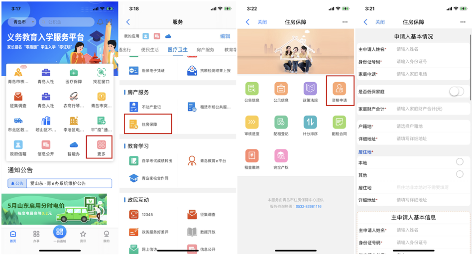 申請步驟如下。在“愛山東·青e辦”APP首頁點擊“更多”,在“房產服務”分類下,找到“住房保障”服務,點擊進入。點擊進入后,在業務辦理頁面選擇“資格申請”點擊進入,在申請人基本情況頁面根據真實情況填寫相關信息并提交。申請提交后,如需查看審核結果,可點擊“審核進度”進行查看。除住房保障資格申請服務外,還可查看公示公告信息、計分排序、配租合同及配租登記、租金繳納等操作。