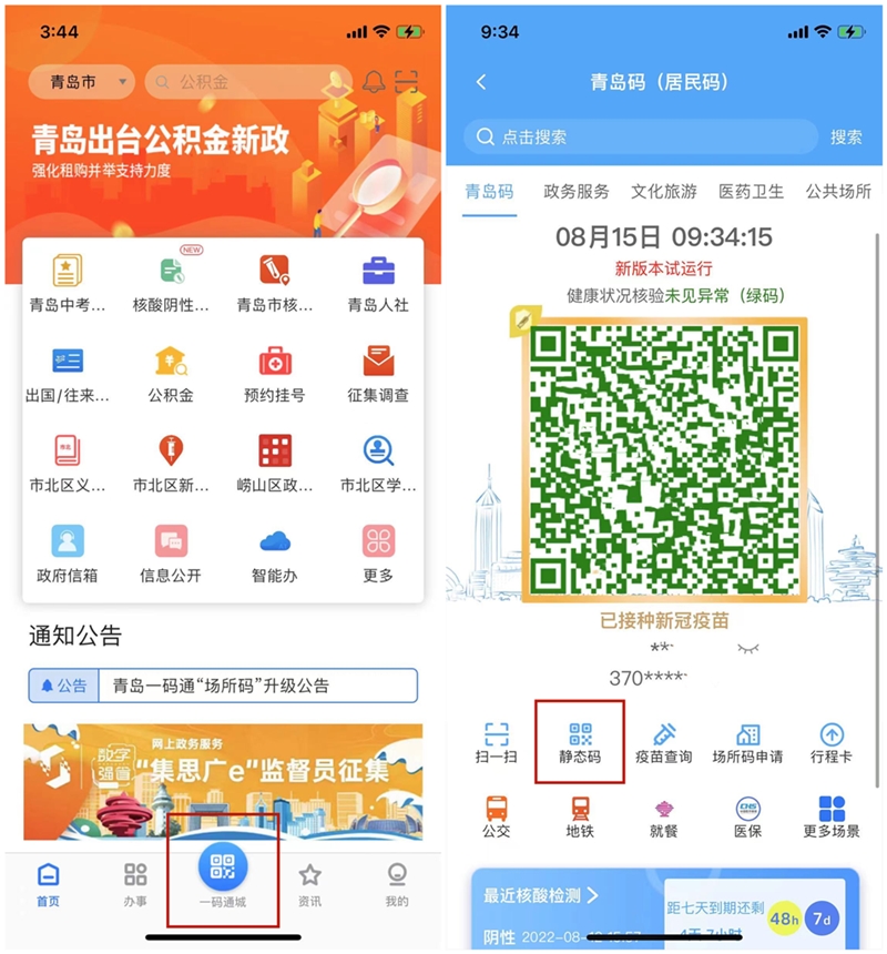 市民可在“愛山東·青e辦”APP首頁點擊底部“一碼通城”,線上領取使用“青島碼”。老年人、中小學生、嬰幼兒等不便使用智能手機的特殊群體,可以直接打印使用“青島碼靜態碼”,通過展示實體二維碼的方式進行身份認證和場所登記,滿足老人和孩子的出行、辦事需求。