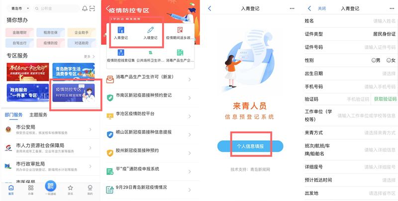 相關(guān)人員來(lái)青返青后,除第一時(shí)間主動(dòng)向所在社區(qū)(村居)或企業(yè)(單位)報(bào)到外,還要登錄“青島市入境人員信息系統(tǒng)”或“來(lái)青人員預(yù)登記系統(tǒng)”,如實(shí)申報(bào)登記有關(guān)信息。計(jì)劃來(lái)青返青的入境人員,由其親友或其親友告知本人提前72小時(shí)登錄“青島市入境人員信息系統(tǒng)”,如實(shí)申報(bào)登記有關(guān)信息。入青返青人員可在“愛山東·青e辦”直接進(jìn)行信息申報(bào),步驟如下。