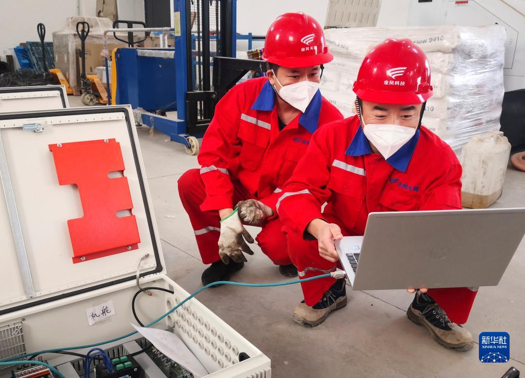 10月16日,在新疆烏魯木齊金風科技天翼達坂城試驗風電場,場長張新旺(右)和同事一起工作。新華社發(周凱 攝)
