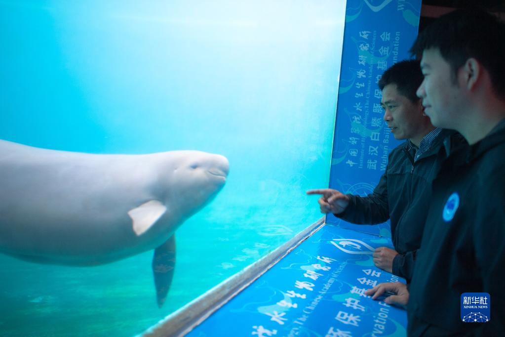 10月18日,在湖北武漢的中科院水生所白鱀豚館,長期從事長江江豚保護研究工作的郝玉江副研究員(左)在向學生講解江豚行為習慣。新華社發
