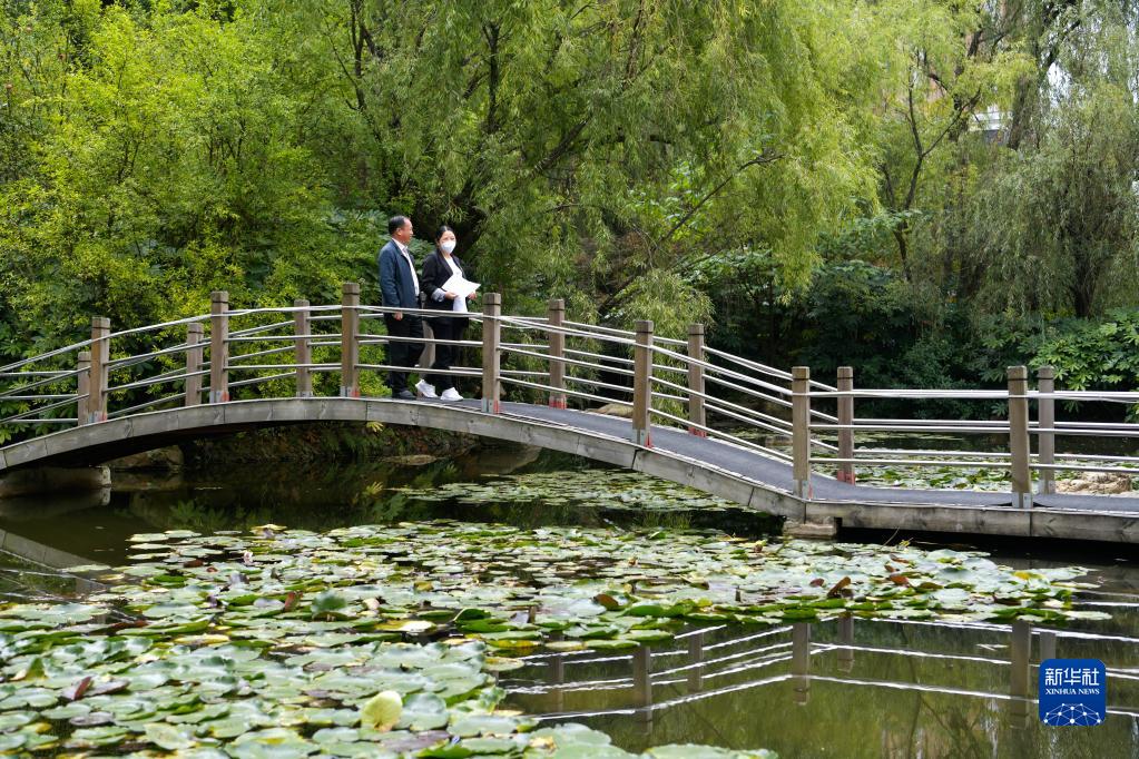 10月16日,在貴州貴陽觀山湖區金陽街道,金元社區黨總支副書記安春燕(右)與居民交流。新華社記者 楊文斌 攝