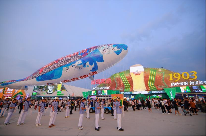 在金沙灘啤酒城,夜晚有無人機表演和藝術巡游,游客能目睹青島啤酒logo組成的超級鯨魚造型從人群中穿行而過,遨游在啤酒節(jié)歡樂的海洋中。伴著金沙灘啤酒城流光溢彩,展示著“醉”美夏夜。