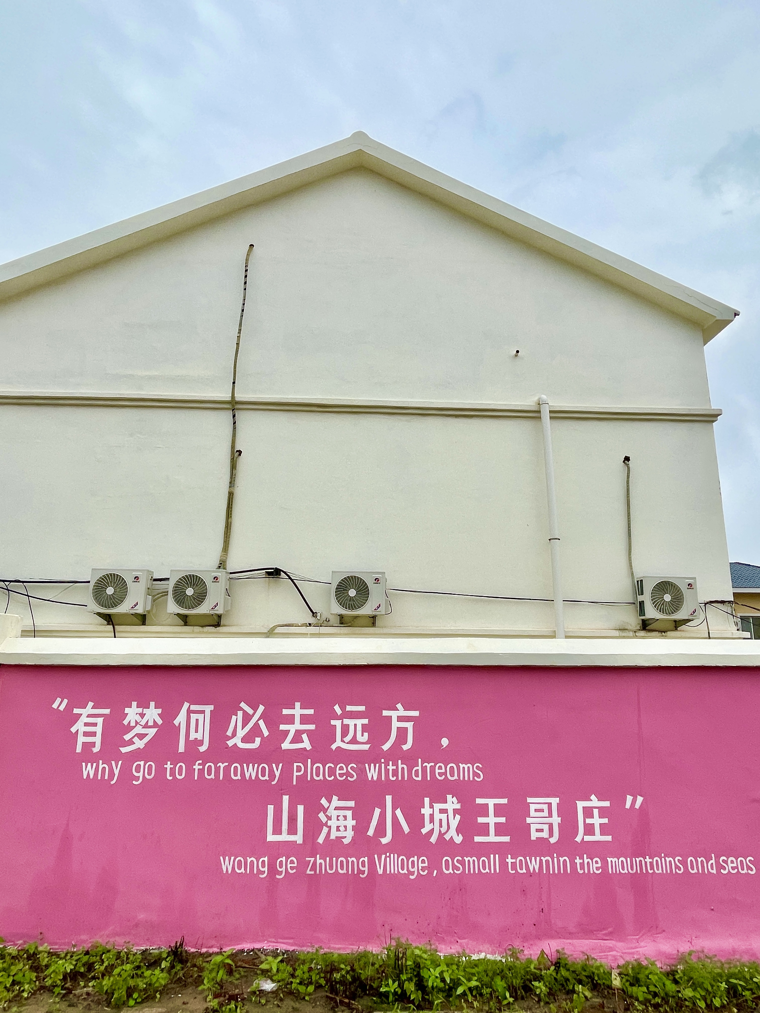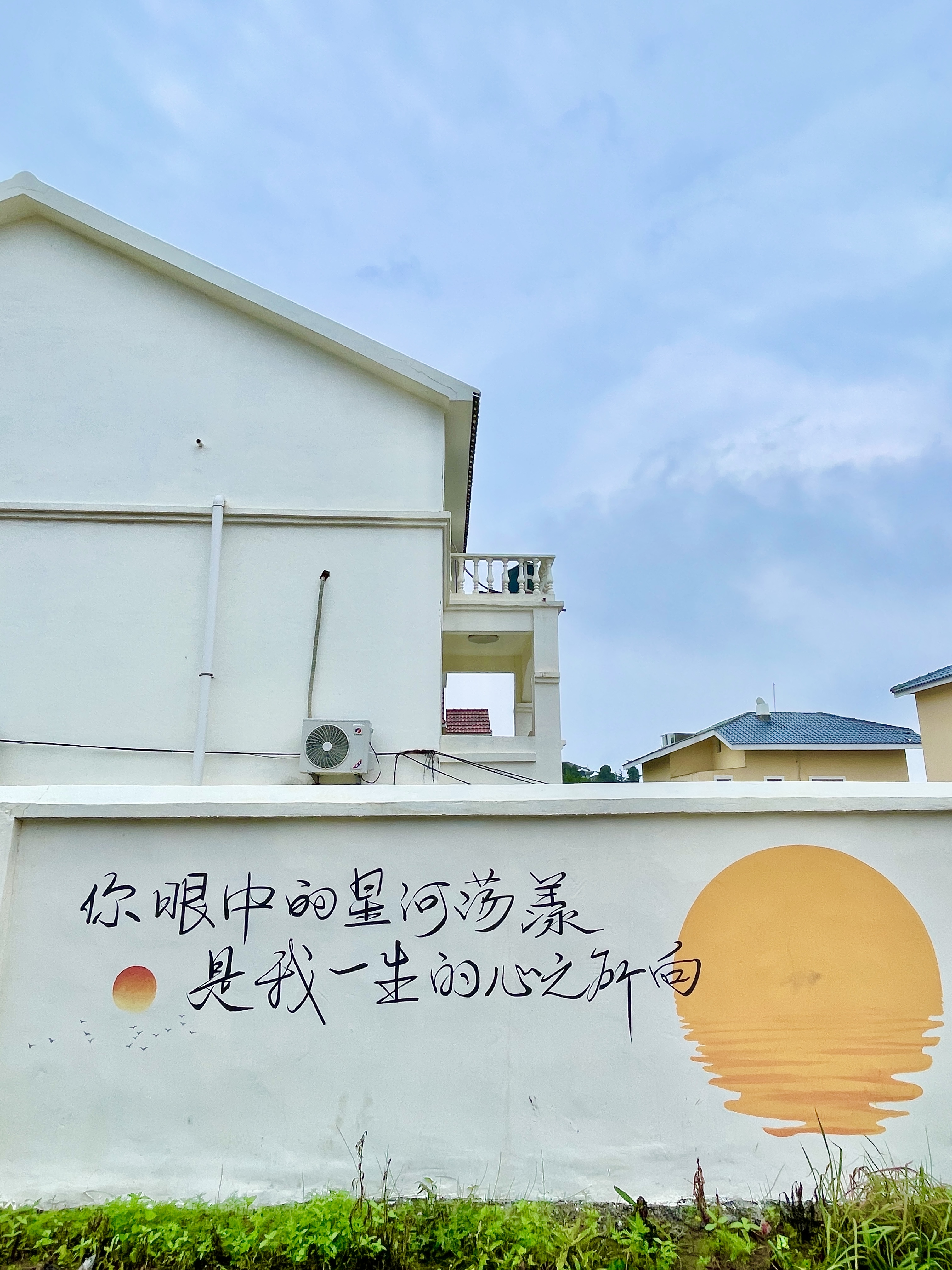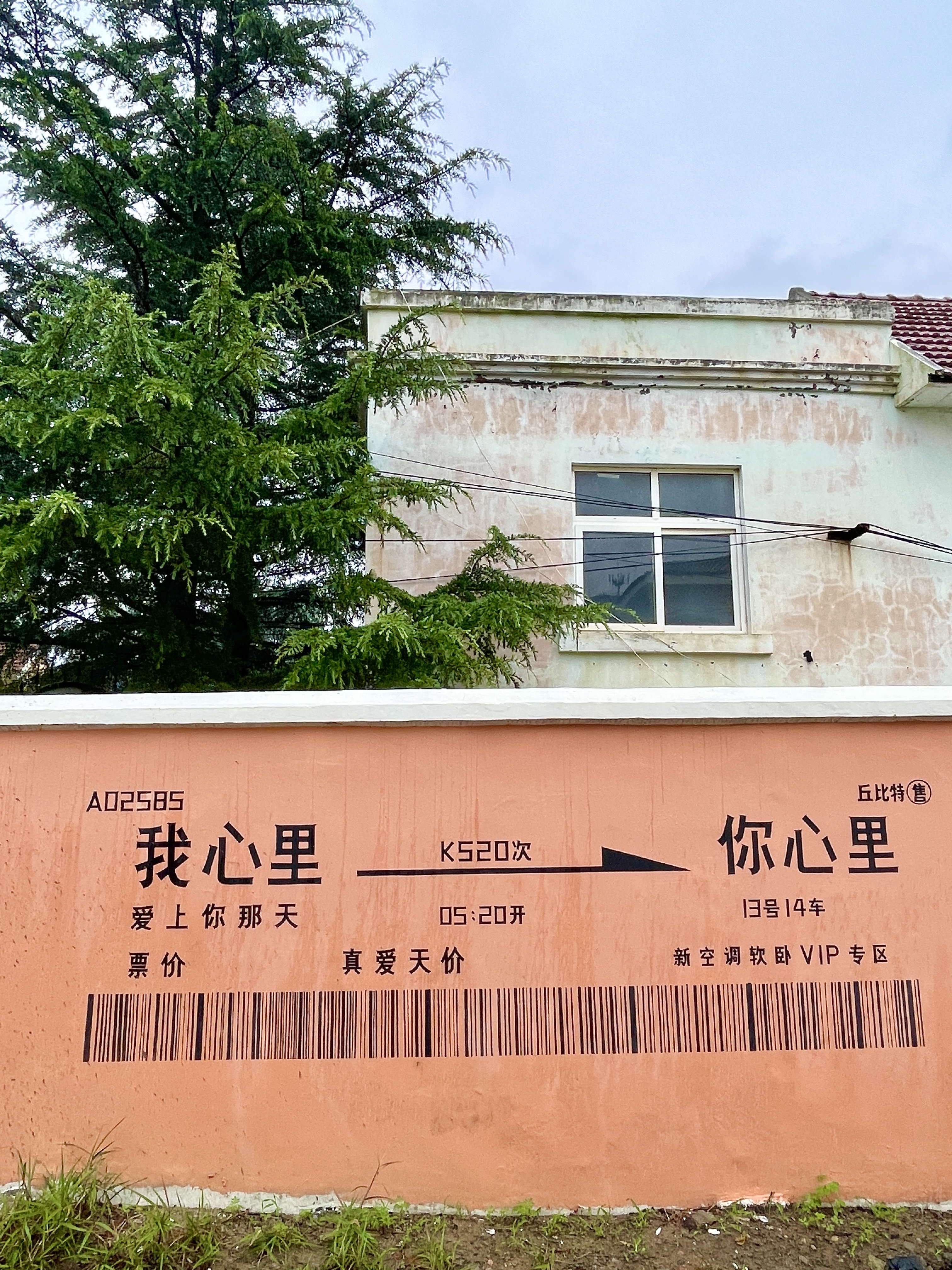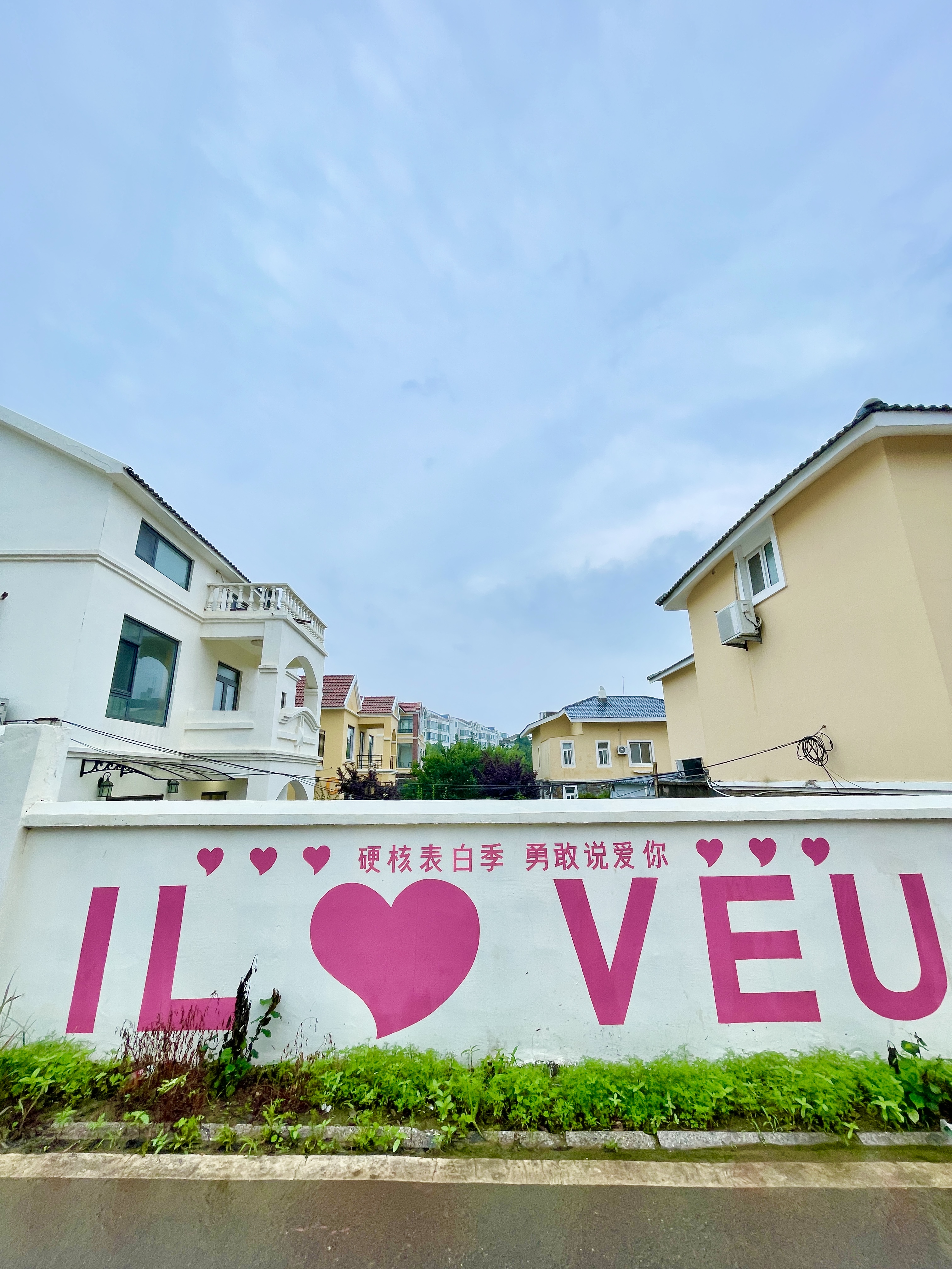 位置有點遠,在嶗山王哥莊,自駕可定位青島君瀾海居民宿,最后拐進小道的時候就會看到涂鴉墻。溫馨提示:拍照時注意過往車輛。