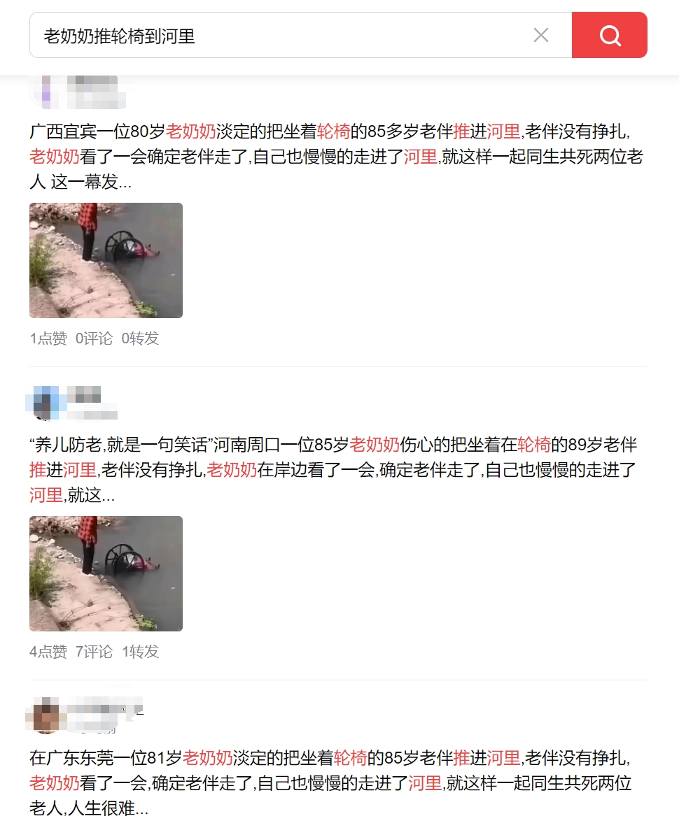 通過觀看原視頻可以發現,老奶奶推的輪椅為空輪椅,并沒有人坐在輪椅上,“把老伴推進河里”的事實并不存在。另外,青島新聞網記者通過搜索近似文本和圖片可以發現,在眾多網絡平臺中有許多類似消息,但時間地點大不相同,無法確定該事件發生在青島。青島公安也表示最近沒有接到相關報案。