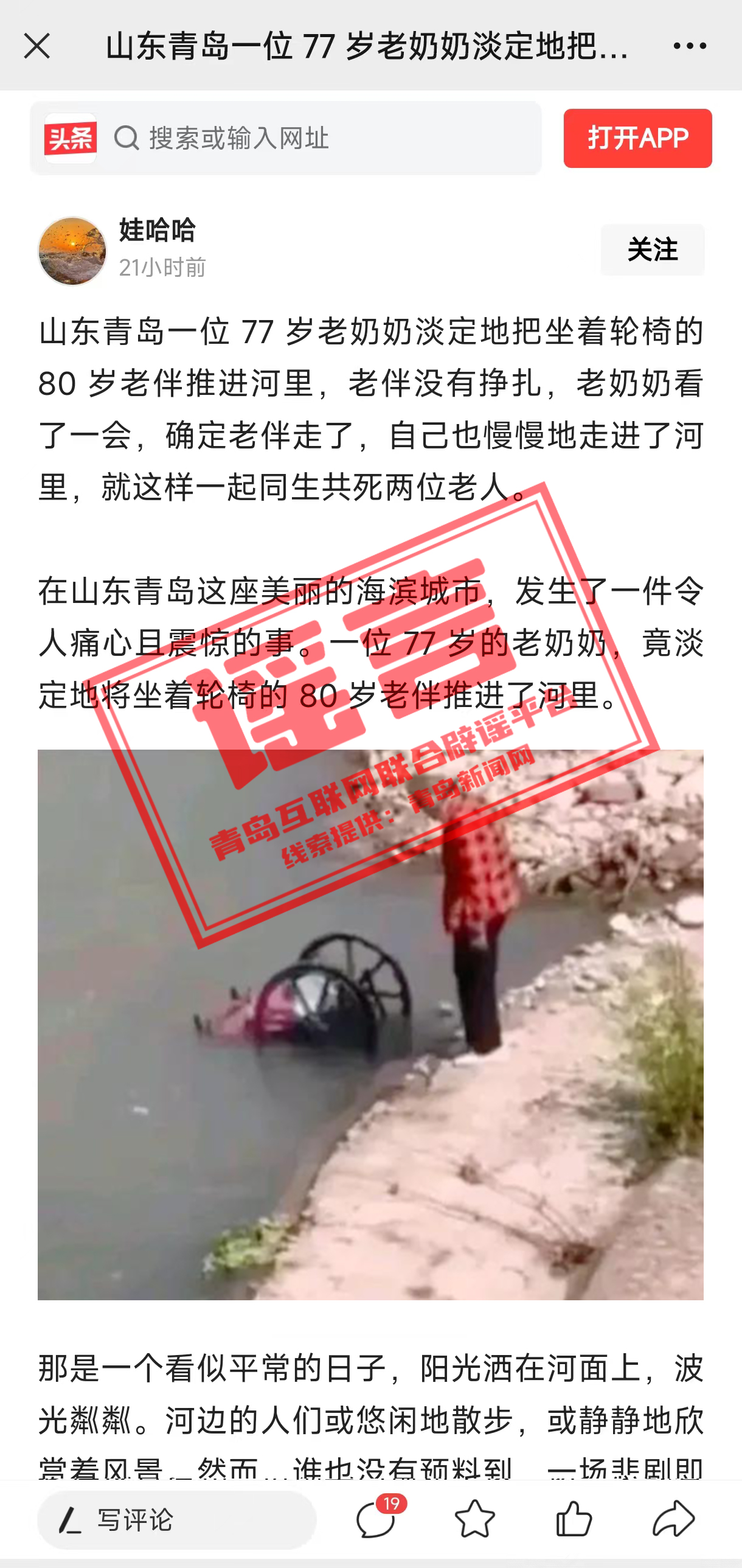青島新聞網訊 7月25日,名為“娃哈哈”的賬號在今日頭條發布題為《青島一老奶奶把坐著輪椅的老伴推進河里》的圖文資訊,引起網絡關注。經查,此事不實。