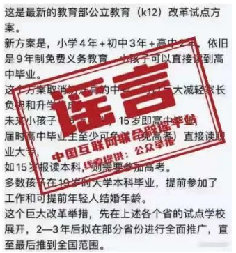 涉教育教學(xué)領(lǐng)域謠言利用廣大學(xué)生和家長對(duì)中招高招、學(xué)制改革、留學(xué)教育、求職招聘等信息的關(guān)切心理,在“招生”“考試”“寒暑假”等時(shí)間節(jié)點(diǎn),散布不實(shí)信息,引發(fā)學(xué)生和家長不必要的教育焦慮,擾亂正常的招考秩序。