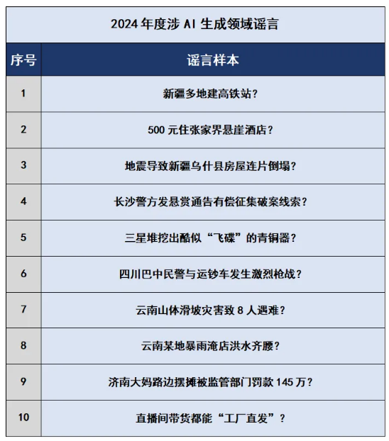 2024年初,“新疆多地建高鐵站”虛假短視頻在網(wǎng)上流傳,此類視頻由軟件智能合成,用戶只需使用指定視頻模板、手動(dòng)替換涉本人家鄉(xiāng)相關(guān)地點(diǎn)的文字即可生成新視頻,利用人們對(duì)家鄉(xiāng)基礎(chǔ)設(shè)施建設(shè)情況的關(guān)注而大肆傳播,誤導(dǎo)公眾。還有個(gè)別網(wǎng)民為獲取流量和不當(dāng)利益,利用AI軟件蓄意歪曲“交警請(qǐng)占道停留的運(yùn)鈔車駛離”的事實(shí),編造謠言“四川巴中民警與運(yùn)鈔車發(fā)生激烈槍戰(zhàn)”,造成公眾恐慌和誤解。此外,謠言“濟(jì)南大媽路邊擺攤被監(jiān)管部門罰款145萬”實(shí)為AI工具生成的虛假文章,大肆消費(fèi)公眾的同情心博取眼球,引發(fā)大范圍傳播,造成不良社會(huì)影響,相關(guān)違法人員被公安機(jī)關(guān)依法行政拘留。“云南山體滑坡災(zāi)害致8人遇難”“地震導(dǎo)致新疆烏什縣房屋連片倒塌”“云南某地暴雨淹店洪水齊腰”等謠言則純屬子虛烏有,均為AI特效炮制的虛假視頻,利用公眾對(duì)災(zāi)難事件的重視編造傷亡情況,制造恐慌情緒,擾亂社會(huì)秩序。