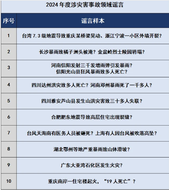 2024年4月初,臺(tái)灣花蓮縣海域發(fā)生7.3級(jí)地震后,有網(wǎng)民編造“地震導(dǎo)致重慶某橋梁晃動(dòng)”“浙江寧波一小區(qū)外墻開裂”等謠言混淆視聽,引發(fā)恐慌。2024年汛期,暴雨、臺(tái)風(fēng)接連來襲,全國多地災(zāi)情嚴(yán)峻,個(gè)別自媒體和網(wǎng)民為博取關(guān)注、吸引流量,或夸大其詞,或移花接木,或無中生有,借機(jī)發(fā)布“河南信陽發(fā)射三千發(fā)增雨彈引發(fā)暴雨”“長沙暴雨致橘子洲頭被淹”“四川達(dá)州洪災(zāi)致多人死亡”“河南鄧州暴雨死了一千多人”“臺(tái)風(fēng)天海南有醫(yī)務(wù)人員被砸死”“上海有人因臺(tái)風(fēng)被吹落高墜”等不實(shí)信息,引發(fā)群眾恐慌,造成不良社會(huì)影響。此外,謠言“廣東大亞灣石化區(qū)發(fā)生火災(zāi)”則是利用人們對(duì)人身財(cái)產(chǎn)安全的重視以及對(duì)環(huán)保安防設(shè)施“火炬”(一種高溫燃燒裝置,石油化工企業(yè)用于保障生產(chǎn)穩(wěn)定、減少環(huán)境污染的安防設(shè)施設(shè)備)的不了解,蓄意制造焦慮,擾亂社會(huì)秩序。