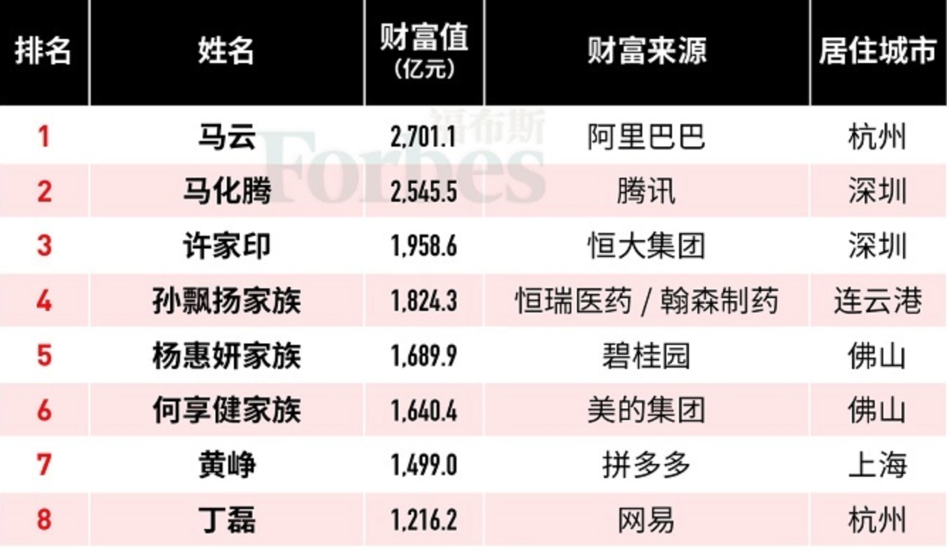 福布斯2019中國富豪榜公布!馬云2701億元居首