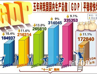 走過5年,中國經(jīng)濟(jì)在世界經(jīng)濟(jì)格局中的地位進(jìn)一步提高。走過“十一五”,在科學(xué)發(fā)展觀的指引下,中國經(jīng)濟(jì)結(jié)構(gòu)調(diào)整不斷深入,在又好又快的道路上不斷前進(jìn)。產(chǎn)業(yè)結(jié)構(gòu)調(diào)整取得積極進(jìn)展。在國民經(jīng)濟(jì)持續(xù)快速增長(zhǎng)的5年中,人民生活也得到持續(xù)改善。就業(yè)規(guī)模持續(xù)增長(zhǎng)。 |